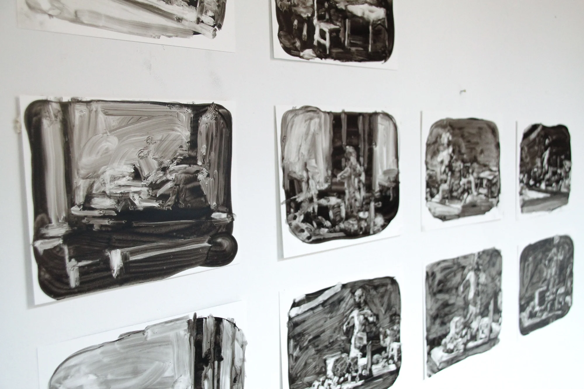 Tell me about these works here. They are interiors in ink on a very smooth paper series of ink drawings in the studio