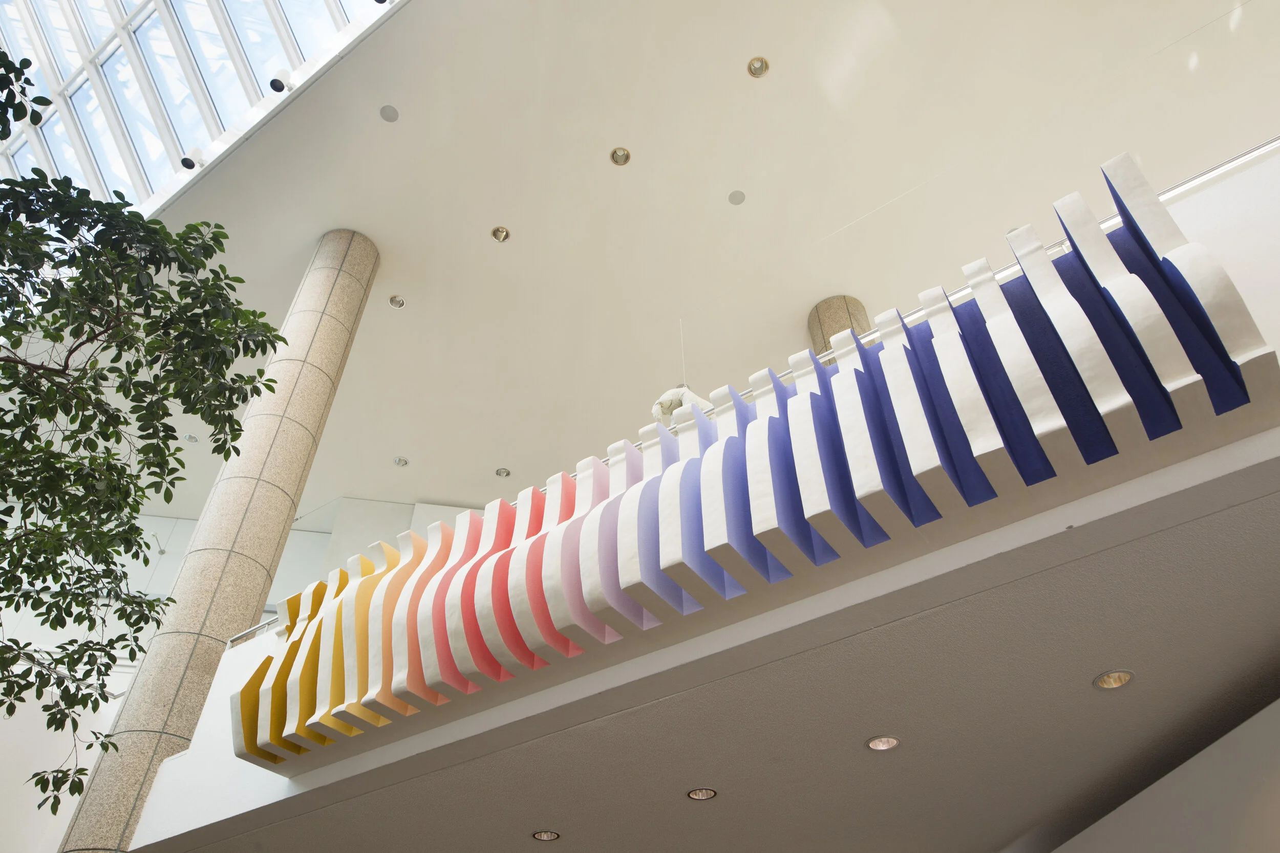 Ich finde, dass die Arbeit, seit dem sie dort hängt, an größerer Strahlkraft gewonnen hat. Sie schwebt und leuchtet regelrecht durch das Oberlicht. Sie passt sich dem Raum, vor allem dem Balkon, perfekt an und ist wirklich ein Teil des Gebäudes geworden. Durch die vielen Perspektiven, die man auf die Installation hat, wenn man sich in diesem großen Foyer bewegt, wandelt sich die Arbeit permanent. Sie ist für diesen Ort gemacht. Es scheint, als wäre sie schon immer dort gewesen.