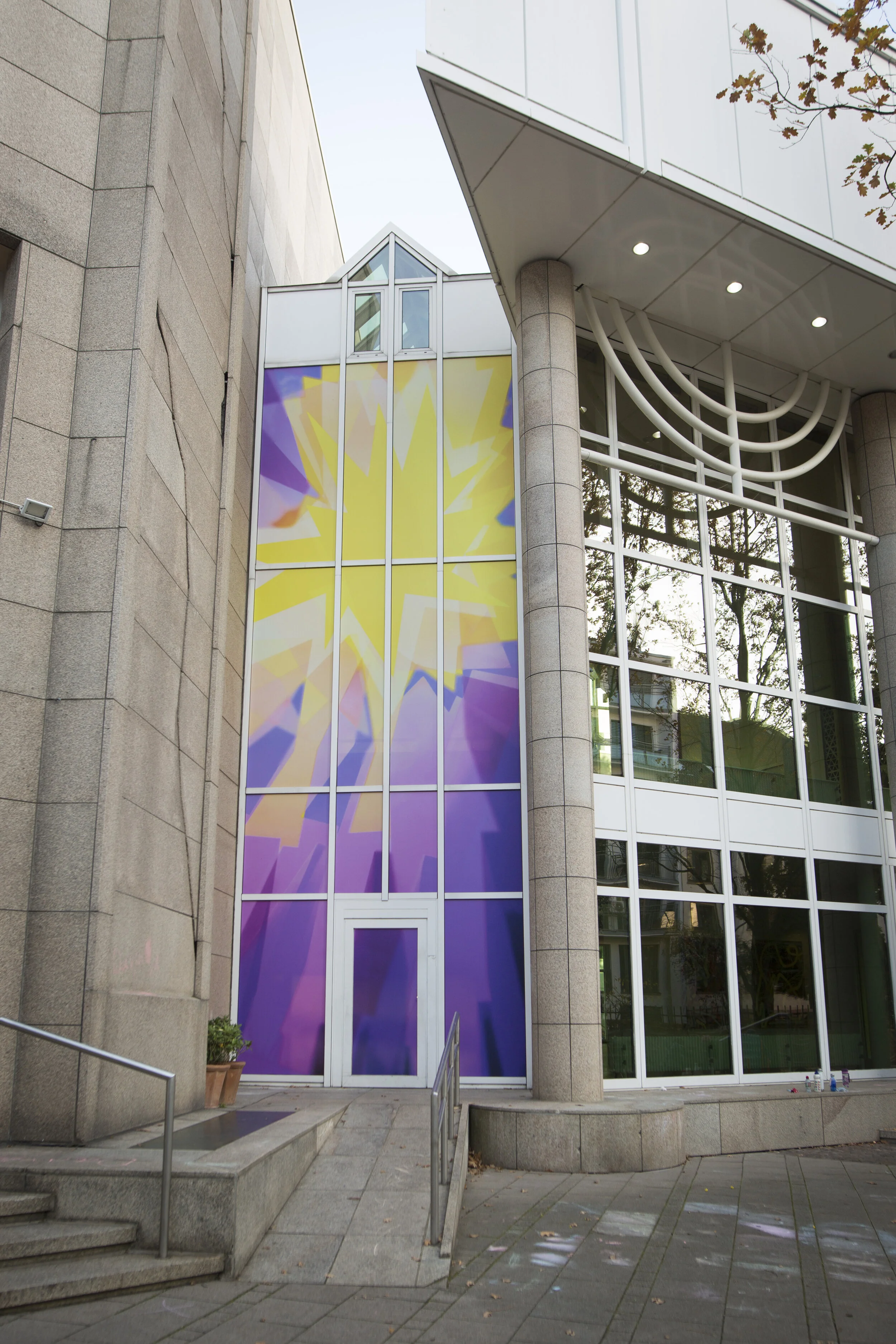 Das Haus wurde 1986 eröffnet, insofern ist es für die Nachkriegsgemeinde symbolisch und im jüdischen Alltag ein wichtiger Bezugspunkt. Gleichzeitig ist die Architektur weit entfernt vom White Cube, insofern mussten wir KünstlerInnen einladen, die mit einem Raum arbeiten können. Die Resonanz war überraschend positiv: von 22 eingeladenen Künstlern haben wir 20 Einreichungen erhalten. Davon stellen wir jetzt 18 aus. Die KünstlerInnen sind ortsspezifisch auf besondere Gegebenheiten eingegangen, haben etwa Entwürfe für die Glasfassade, für die Balustrade, und für unter die geschwungene Freitreppe eingereicht. Ein Künstler hat sogar unmittelbar auf eine fest installierte Menora reagiert, die im Alltag kaum Beachtung findet. Eine interessante technische Beobachtung: Den KünstlerInnen sind Abweichungen in der Symmetrie der Architektur, die das Auge der meisten von uns nicht wahrnimmt, aufgefallen. Rein inhaltlich haben sie sich mit ihrer eigenen Identität und mit Judentum in Deutschland heute beschäftigt.