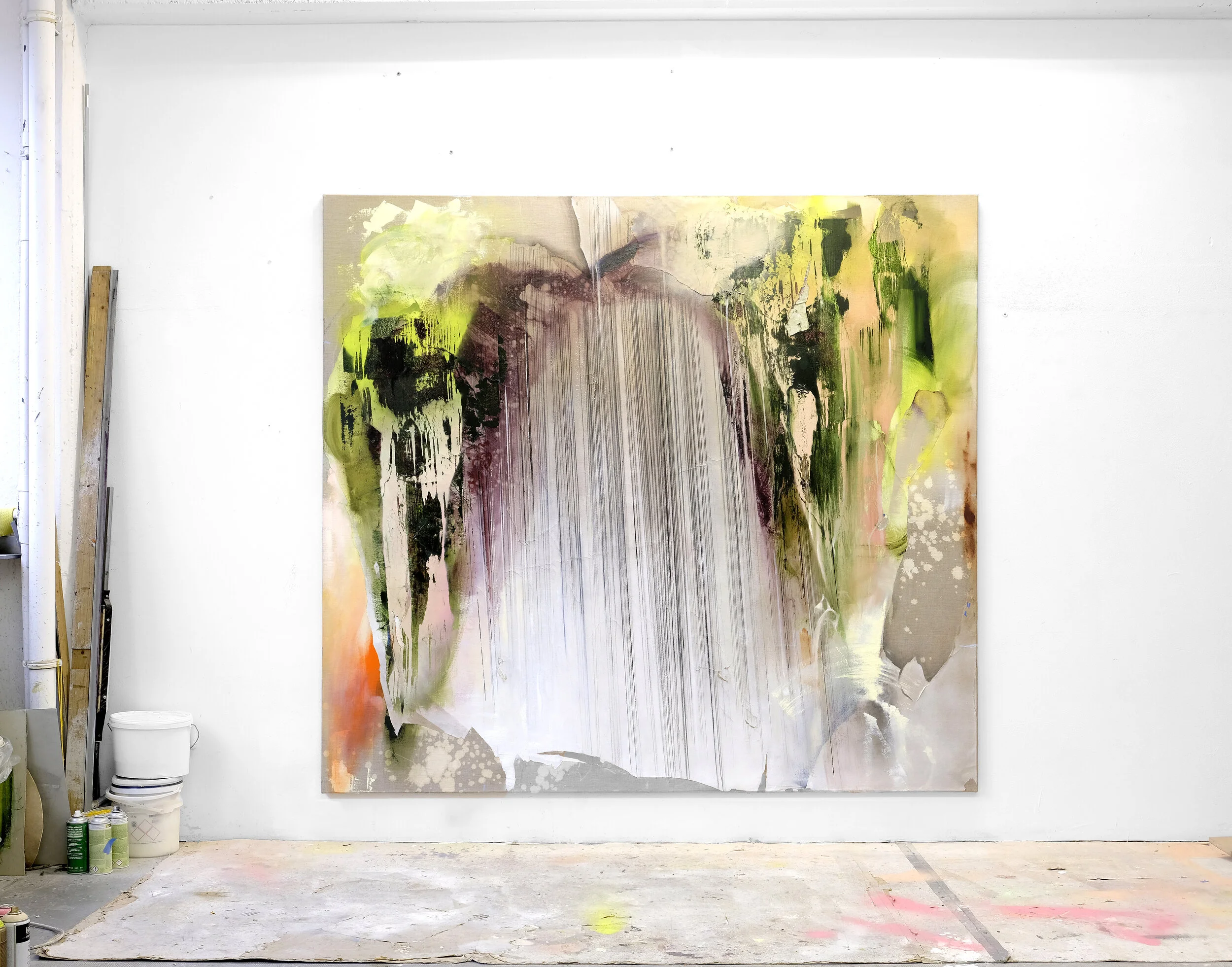Installationsansicht Perfect Storm, Galerie Tanja Wagner, 2019 – links: Breath, Papier, Sprühfarbe, Graphit, Öl auf Leinwand, 180 x 150 cm, 2019 – rechts: Petrichor, Papier, Sprühfarbe, Graphit, Öl auf Leinwand, 150 x 135 cm, 2019 – Raum: Lumina, gelb eingefärbte Galeriewände