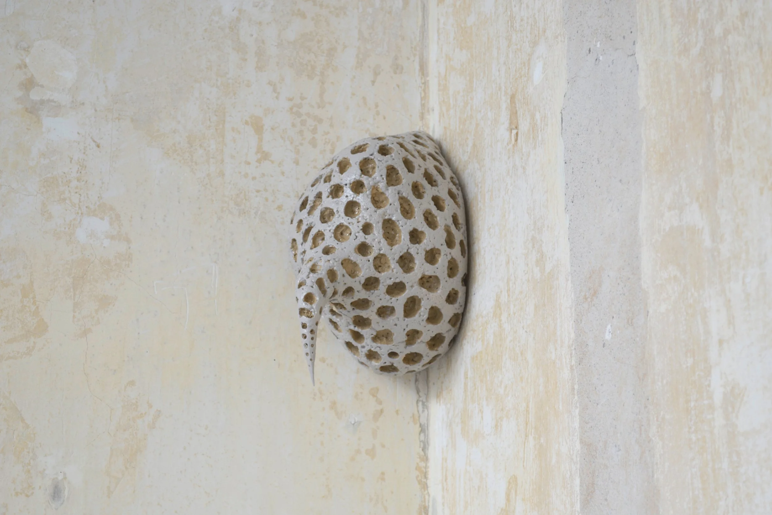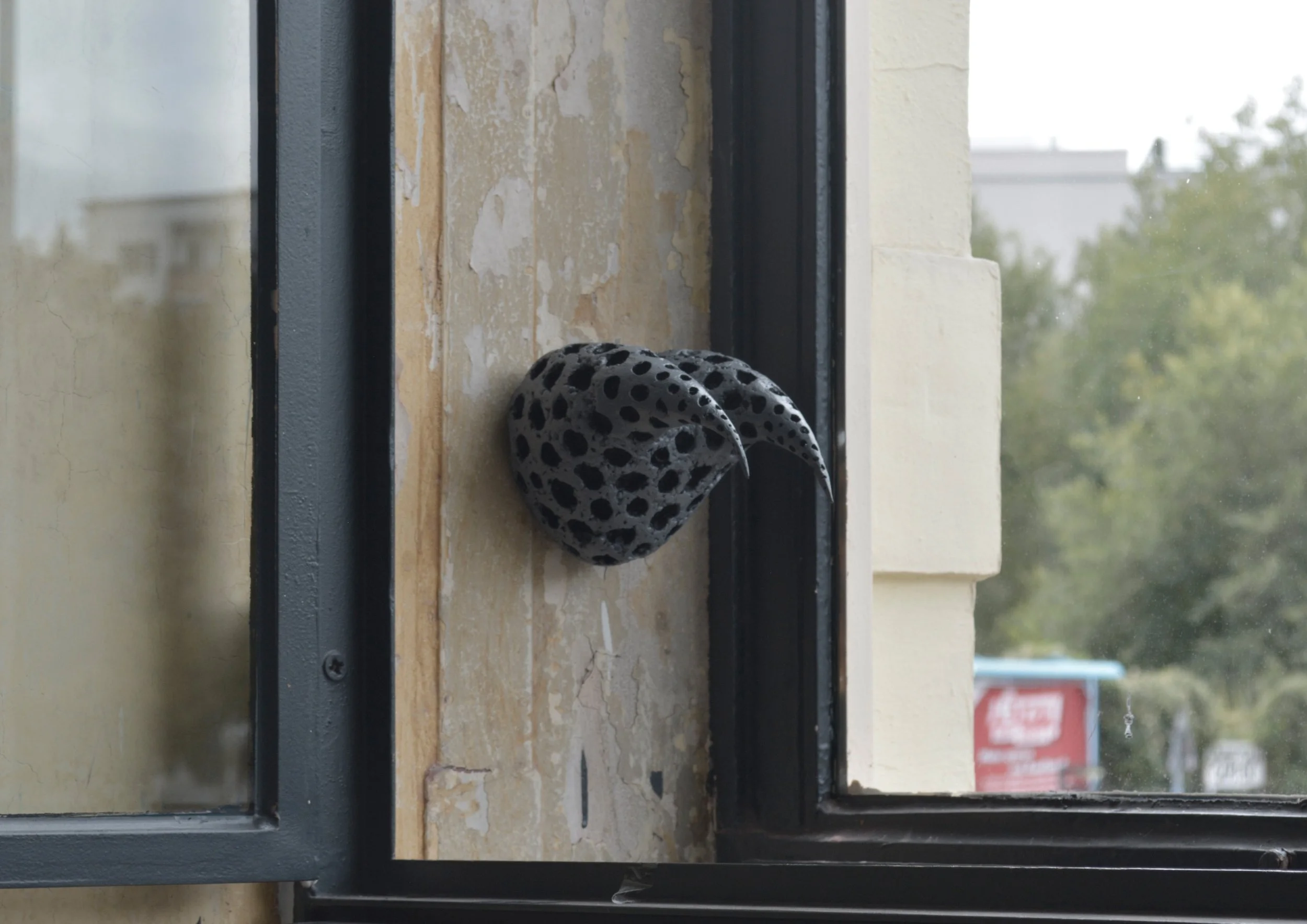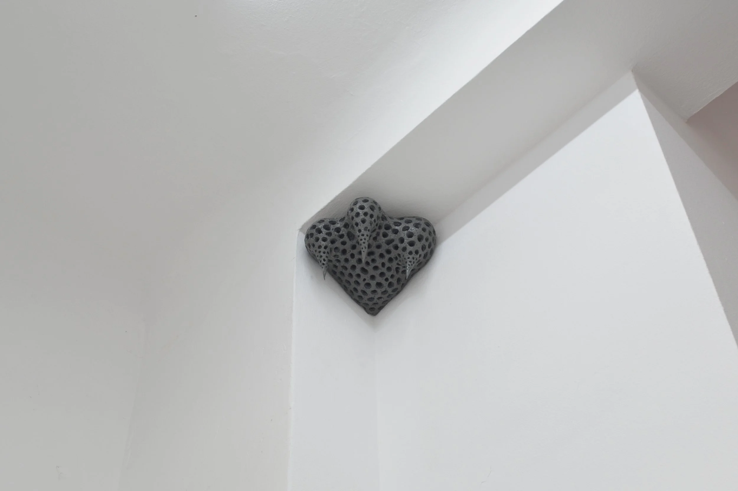 In verschiedenen Ecken und Nischen des Ausstellungsraumes haben sich kleine Objekte eingenistet, die, verbunden durch ein unsichtbares Netz im Raum, zu korrespondieren scheinen. Wie verschiedene Spezies einer Gattung unterscheiden sie sich in ihrer natürlich anmutenden Farbigkeit und dringen leise, fast unmerklich, in die Architektur ein. Die biomorphe Formgebung dieser Organismen steht im Kontrast zu der künstlichen Materialität, wodurch die Objekte als Fremdkörper entlarvt werden und sich plötzlich jeglicher Natürlichkeit entziehen. Es entsteht eine Art organische Abstraktion, die ein Spannungsfeld zwischen der natürlichen Form und dem industriell gefertigten Material eröffnet. Diese vorgetäuschte Natürlichkeit geht einher mit der Ungewissheit über die Bedeutung der Objekte: die Öffnungen in der Oberfläche können als Unterschlupf dienen, gleichzeitig kann das nest jedoch als eigenständiges Wesen und Bewohner*in eines Ortes verstanden werden.